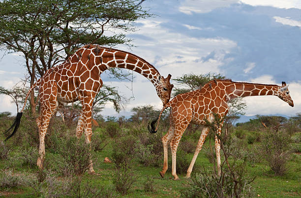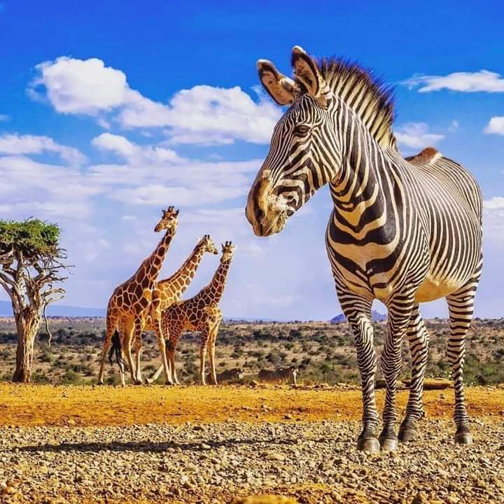 On the banks of the palm-lined Ewaso Nyiro River, Samburu National Reserve, Buffalo Springs, and Shaba Reserves lie in an arid region in the remote north of Kenya. Shaba National Reserve is one of two areas where George Adamson and Joy Adamson raised Elsa the lioness, made famous in the film Born Free. The wildlife in all three reserves depends on the waters of the river to survive, and many species are specially adapted to the parched conditions, Special Five of Samburu: Reticulated Giraffe, Grevy zebra; Somali ostrich; Beisa Oryx, and gerenuk, A top attraction in Samburu National Reserve are the Sarara Singing Wells, local watering holes where Samburu warriors sing traditional songs while hauling water for their cattle to drink.